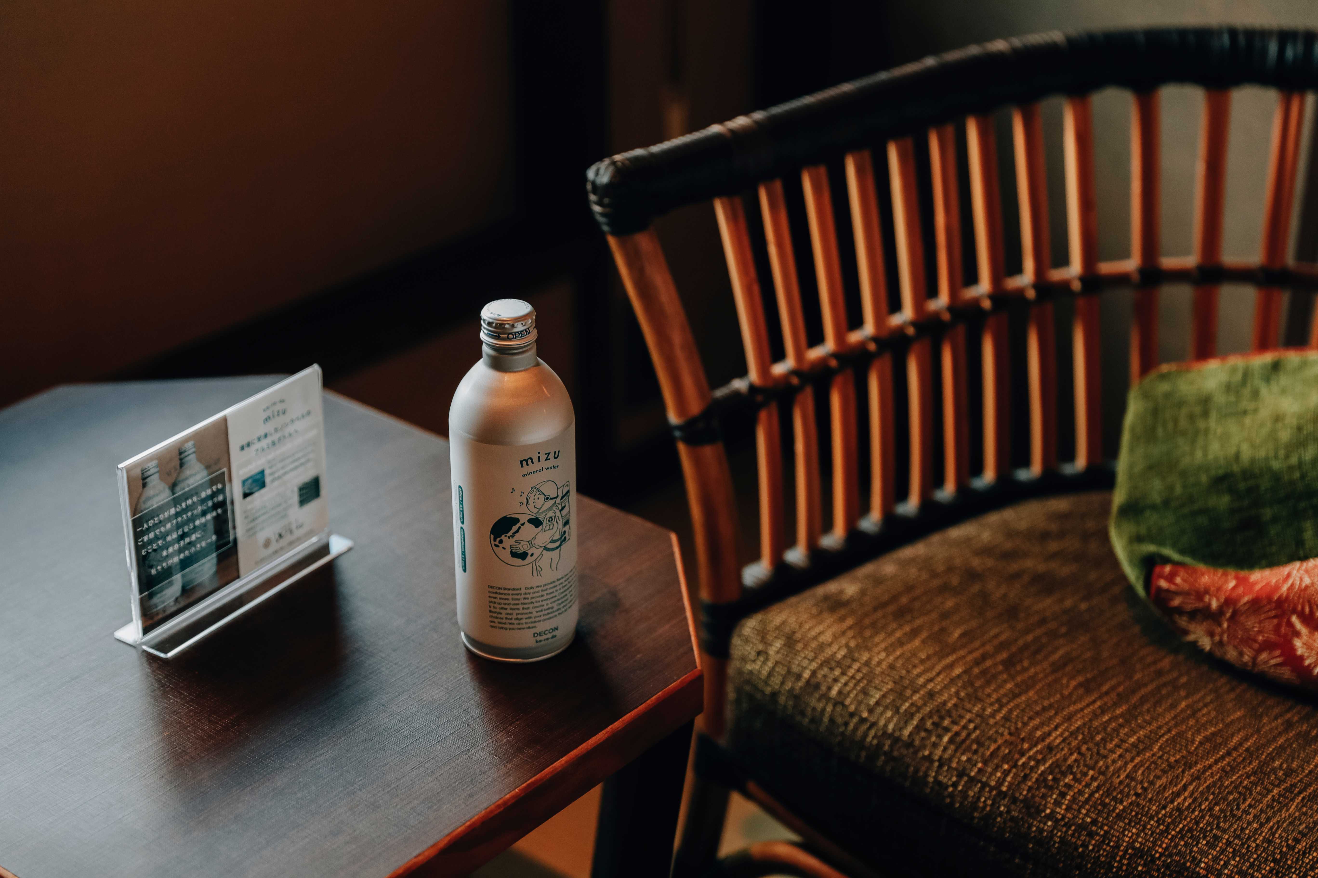 「アルミ缶のmizuは、空間の雰囲気を壊さない。見た目も洗練されていてかっこいい」と、ペットボトルではなく、アルミ缶ボトルの水を選んでいただいた背景には、宿の世界観との親和性がありました。